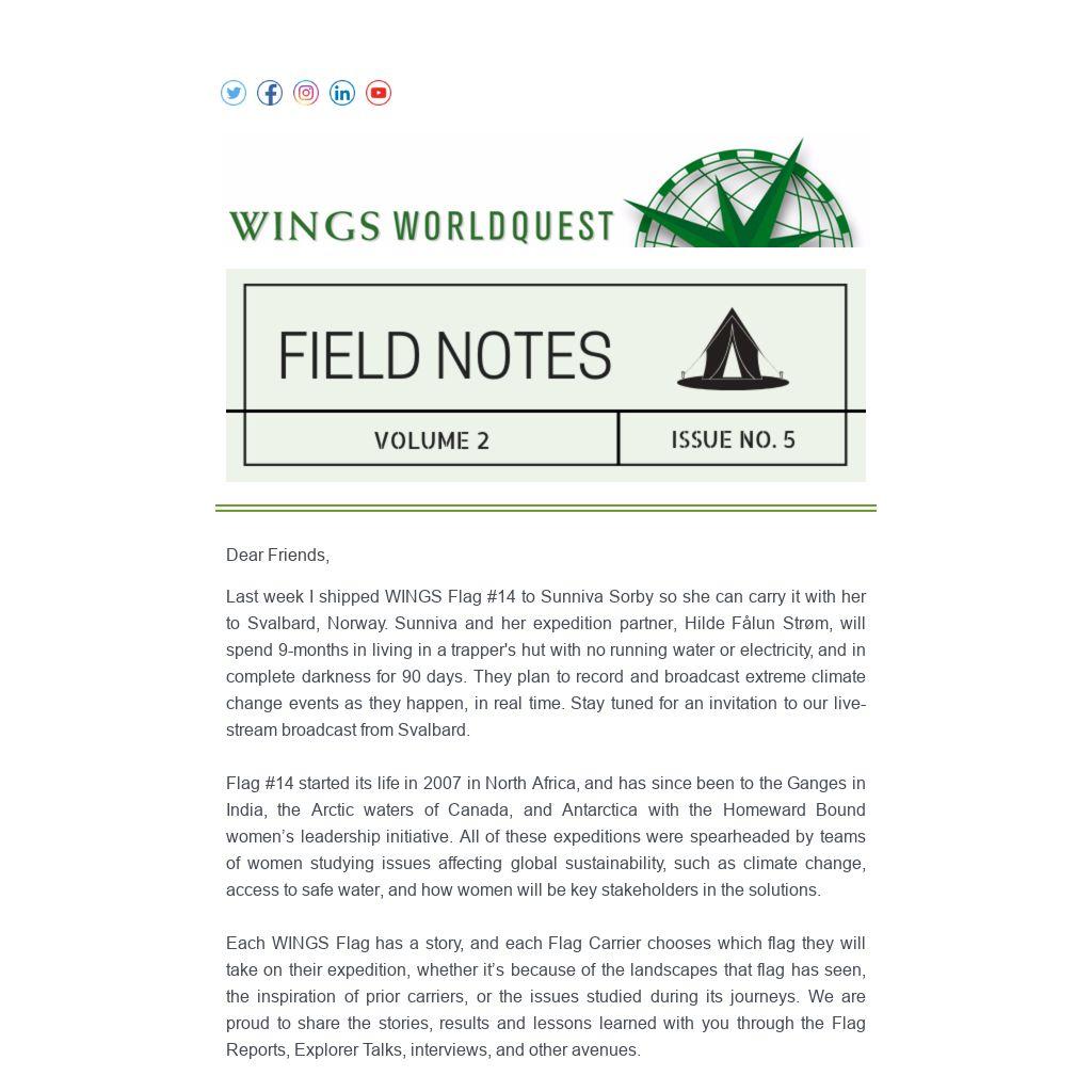 Each WINGS Flag has a story, and each Flag Carrier chooses which flag they will take on their expedition, whether it’s because of the landscapes that flag has seen, the inspiration of prior carriers, or the issues studied during its journeys. We are proud to share the stories, results and lessons learned with you through the Flag Reports, Explorer Talks, interviews, and other avenues.