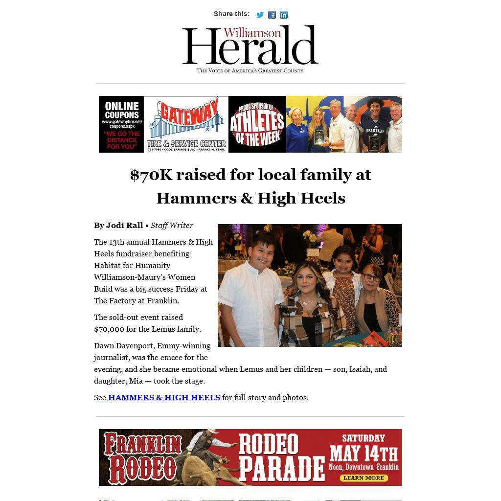 At the top of this eblast you will see buttons to make it easy for you to share this eblast with friends via email, Facebook, Twitter and LinkedIn and follow the Herald. We are listed as wherald, whsports and wherald_ads. Also, like us on FACEBOOK, and don't forget to visit us online at WilliamsonHerald.com. Please patronize our e-blast advertisers and those who advertise and support us in our weekly publication.