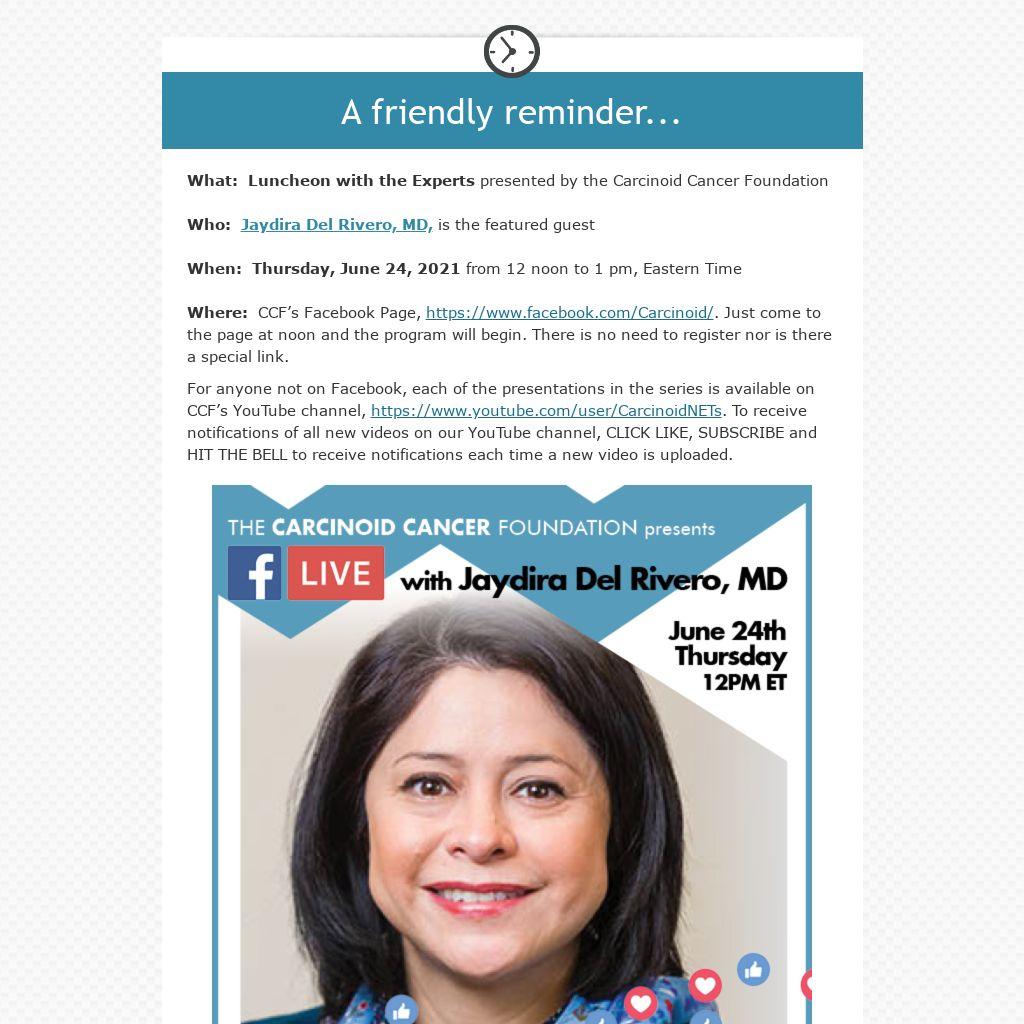For anyone not on Facebook, each of the presentations in the series is available on CCF’s YouTube channel, https://www.youtube.com/user/CarcinoidNETs. To receive notifications of all new videos on our YouTube channel, CLICK LIKE, SUBSCRIBE and HIT THE BELL to receive notifications each time a new video is uploaded.