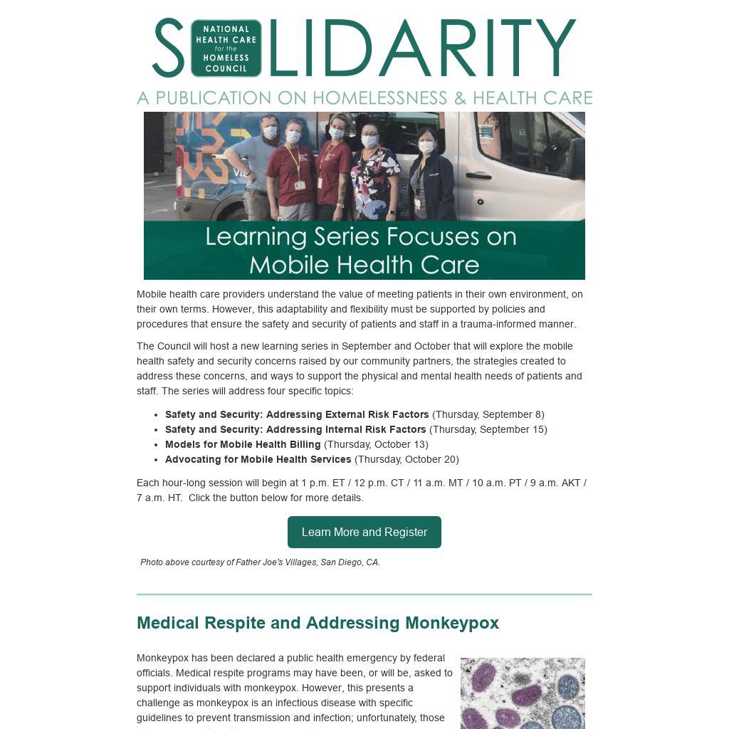 The Council will host a new learning series in September and October that will explore the mobile health safety and security concerns raised by our community partners, the strategies created to address these concerns, and ways to support the physical and mental health needs of patients and staff. The series will address four specific topics: