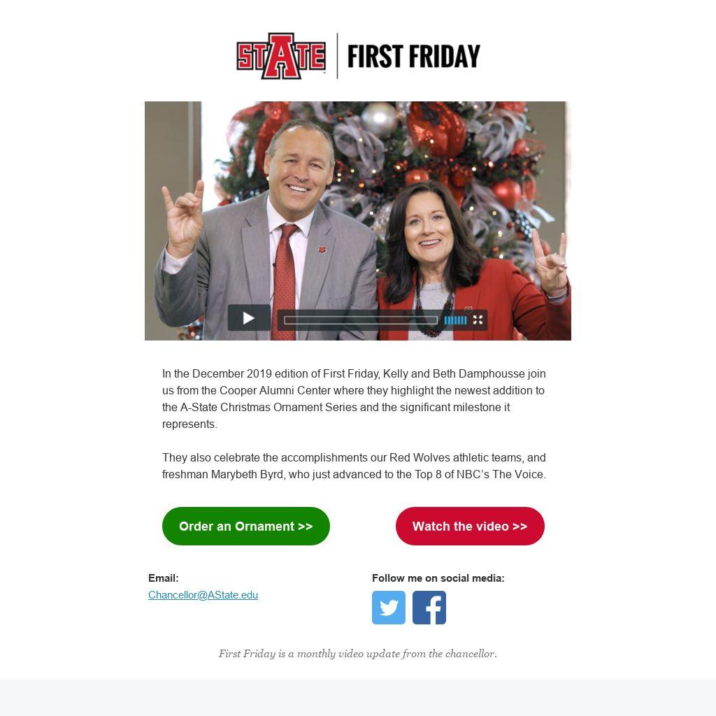 In the December 2019 edition of First Friday, Kelly and Beth Damphousse join us from the Cooper Alumni Center where they highlight the newest addition to the A-State Christmas Ornament Series and the significant milestone it represents.