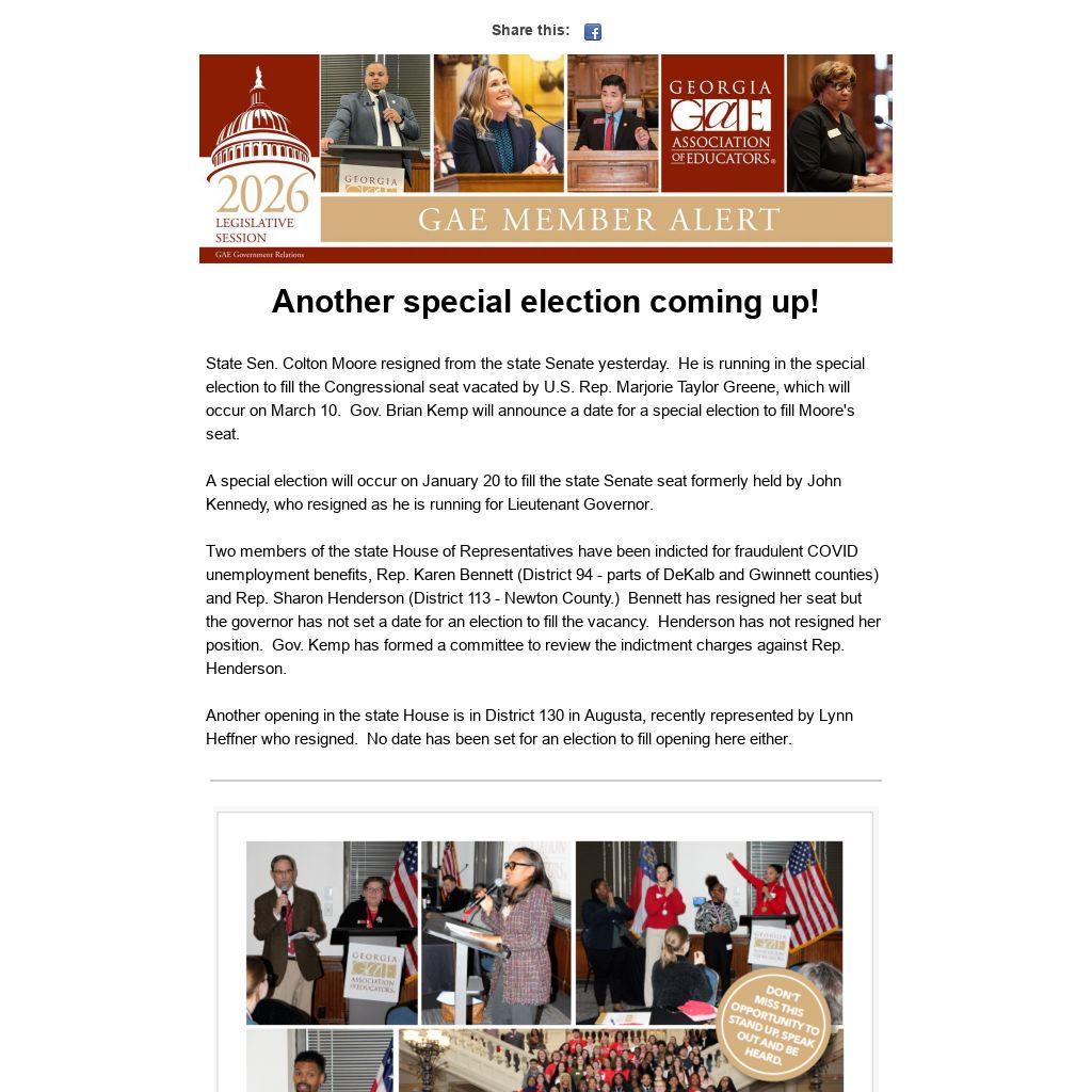 Two members of the state House of Representatives have been indicted for fraudulent COVID unemployment benefits, Rep. Karen Bennett (District 94 - parts of DeKalb and Gwinnett counties) and Rep. Sharon Henderson (District 113 - Newton County.) Bennett has resigned her seat but the governor has not set a date for an election to fill the vacancy. Henderson has not resigned her position. Gov. Kemp has formed a committee to review the indictment charges against Rep. Henderson.
