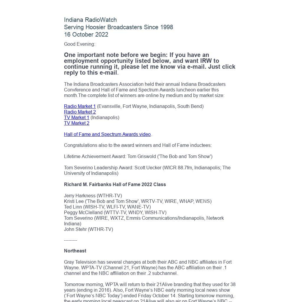 Here’s an update to two WPTA broadcasters that announced they are leaving the station. Fort Wayne's NBC Today co-host Jack Keenan announced that he will become an anchor of the early morning news at Hearst’s KETV-TV in Omaha, Nebraska, starting on Halloween (10/31). ABC21 meteorologist Gabe Prough announced he will join the weather team at Nexstar’s WHO-TV in Des Moines, Iowa.