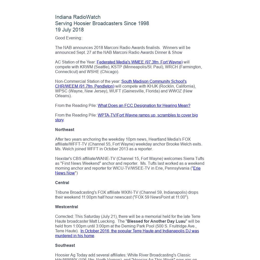 Indiana RadioWatch subscriptions are free. To subscribe, send an e-mail to irw@well.com and we'll add you. After publication, we archive Indiana RadioWatch on the Indiana Radio Archive at http://www.indianaradio.net. Please e-mail us your news stories and employment opportunities.