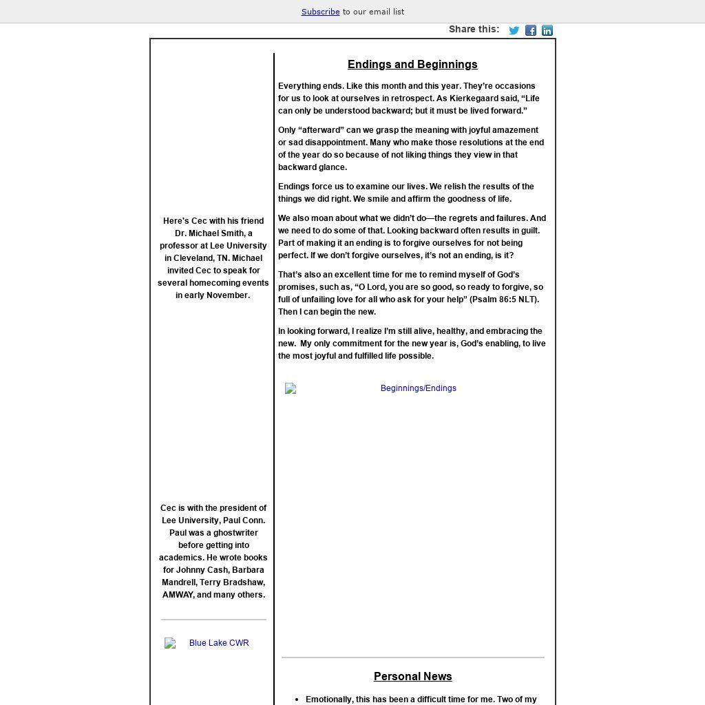 Words from My Assistant, Twila Belk Prolific author and storyteller Steven James has invited Cec to give an inspirational message for his upcoming conference for novelists in Atlanta on January 28. His reason? "Because YOU were a huge encouragement to me early in my career and I want to share you with the next generation of writers!" What a great way for Cec to celebrate his 84th birthday! I have the privilege of being a regular contributor to Positive Note Magazine. My article for the current issue is "A Grateful Heart." On November 4, I had a bilateral mastectomy. Pathology showed that the tumor had responded to my neo-adjuvant chemo, but there was residual cancer. The good news is that surgery removed the tumor and there was no lymph node involvement. However, it's possible I could still have a stray cancer cell floating around in my body, and my oncologist has offered me the option of doing more chemo, this time with a pill. My decision right now is to pass on that fabulous (insert sarcastic tone here) opportunity. I'll meet with a plastic surgeon on December 21 to discuss reconstruction. If you'd like to receive periodic updates about my breast cancer journey, you're welcome to visit my Care Pages site. (You'll need to create an account to log in.) Here's my latest update.