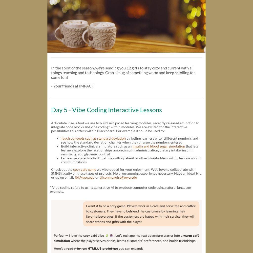Check out the cozy cafe game we vibe-coded for your enjoyment. We’d love to collaborate with SMHS faculty on these types of projects. No programming experience necessary. Have an idea? Hit us up on email: lbl@gwu.edu or alisonmcguire@gwu.edu