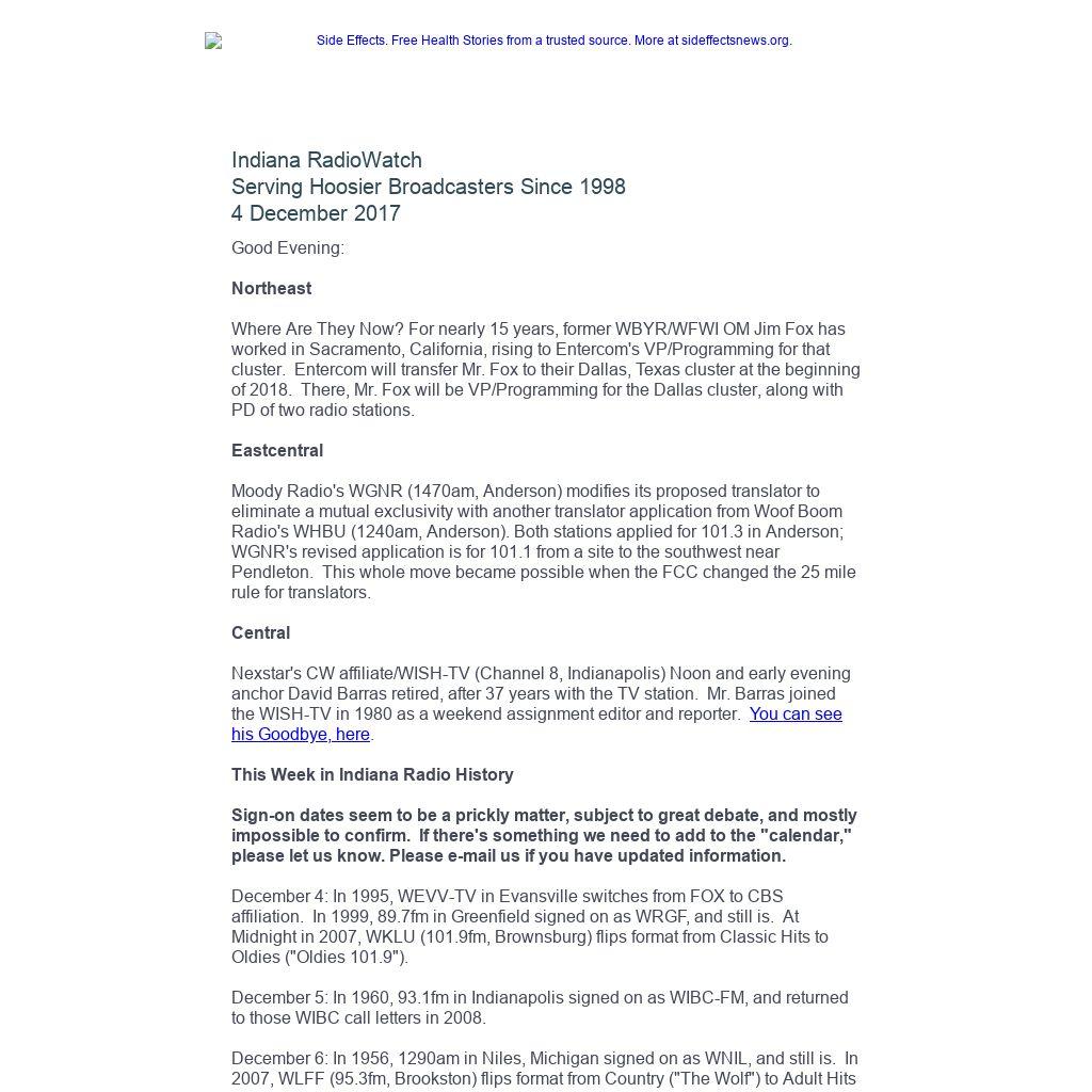 Indiana RadioWatch subscriptions are free. To subscribe, send an e-mail to irw@well.com and we'll add you. After publication, we archive Indiana RadioWatch on the Indiana Radio Archive at http://www.indianaradio.net. Please e-mail us your news stories and employment opportunities.