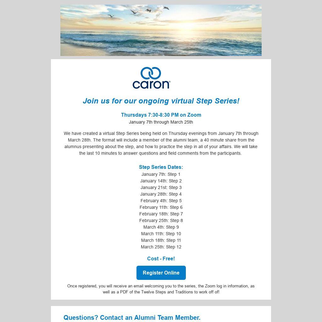 We have created a virtual Step Series being held on Thursday evenings from January 7th through March 28th. The format will include a member of the alumni team, a 40 minute share from the alumnus presenting about the step, and how to practice the step in all of your affairs. We will take the last 10 minutes to answer questions and field comments from the participants.