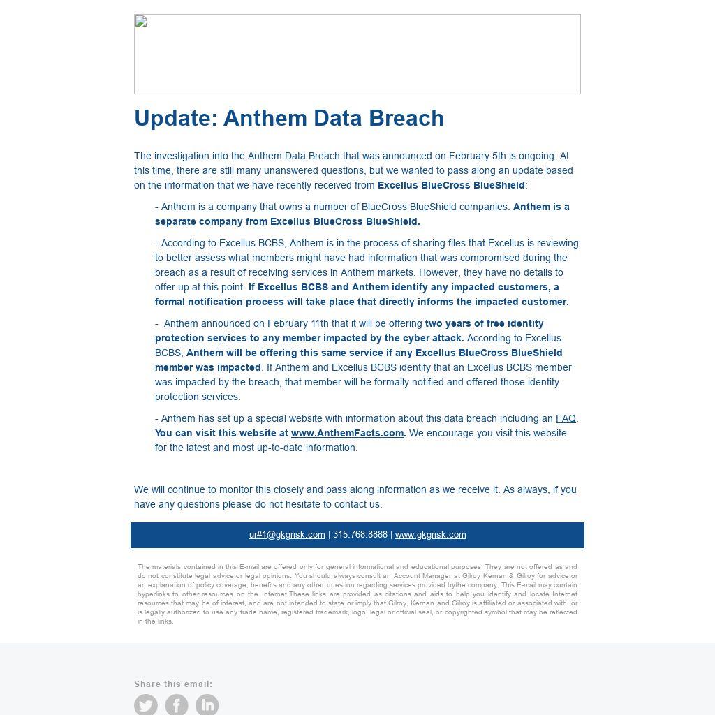The investigation into the Anthem Data Breach that was announced on February 5th is ongoing. At this time, there are still many unanswered questions, but we wanted to pass along an update based on the information that we have recently received from Excellus BlueCross BlueShield: