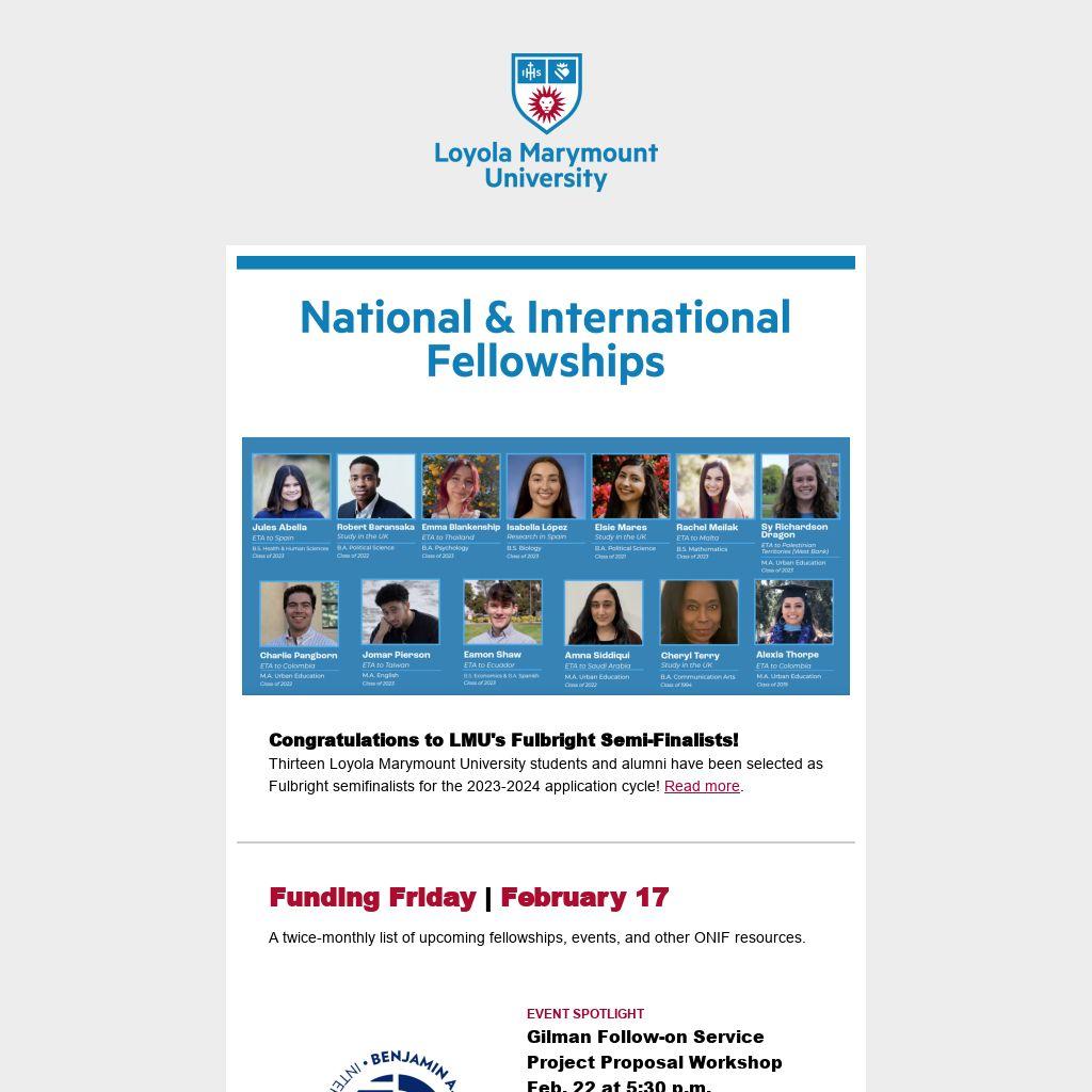 Thirteen Loyola Marymount University students and alumni have been selected as Fulbright semifinalists for the 2023-2024 application cycle! Read more.