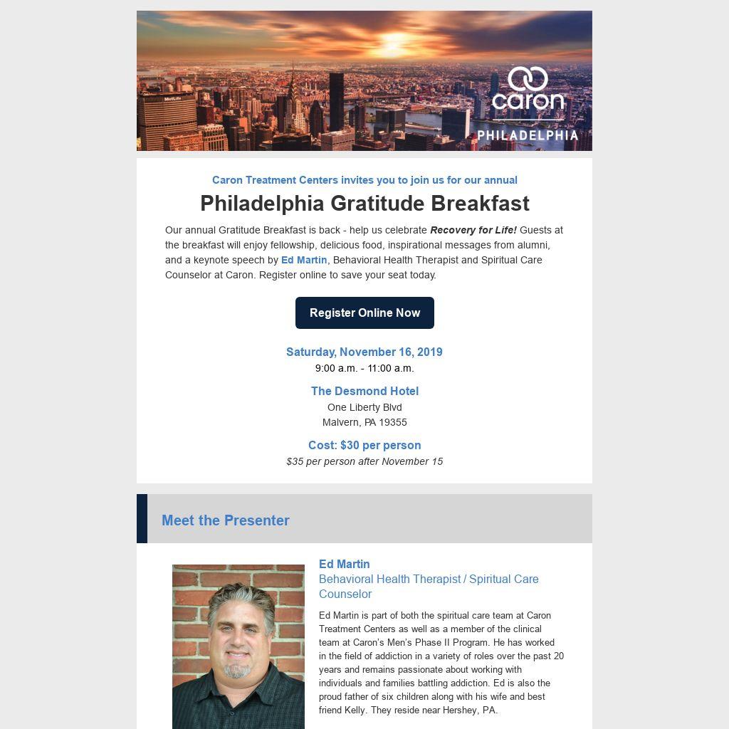 Our annual Gratitude Breakfast is back - help us celebrate Recovery for Life! Guests at the breakfast will enjoy fellowship, delicious food, inspirational messages from alumni, and a keynote speech by Ed Martin, Behavioral Health Therapist and Spiritual Care Counselor at Caron. Register online to save your seat today.