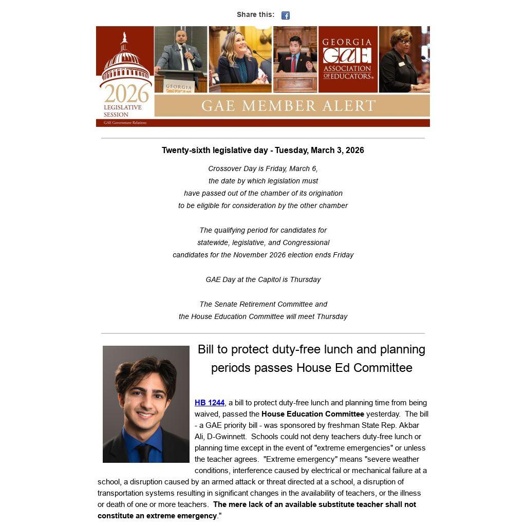 HB 1244, a bill to protect duty-free lunch and planning time from being waived, passed the House Education Committee yesterday. The bill - a GAE priority bill - was sponsored by freshman State Rep. Akbar Ali, D-Gwinnett. Schools could not deny teachers duty-free lunch or planning time except in the event of "extreme emergencies" or unless the teacher agrees. "Extreme emergency" means "severe weather conditions, interference caused by electrical or mechanical failure at a school, a disruption caused by an armed attack or threat directed at a school, a disruption of transportation systems resulting in significant changes in the availability of teachers, or the illness or death of one or more teachers. The mere lack of an available substitute teacher shall not constitute an extreme emergency."
