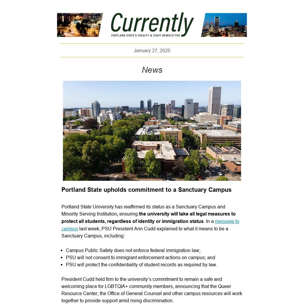 CURRENTLY is a weekly newsletter for the employees of Portland State University, published by University Communications. News items, events and accolades should be sent to currently@pdx.edu. Deadline is noon, the Tuesday before publication. See the Currently website for submission guidelines and schedule.