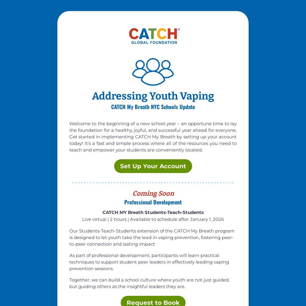 CATCH publishes a quarterly e-Newsletter focused on youth vaping prevention—featuring the latest research, stories from the field, training opportunities, resources, and more.