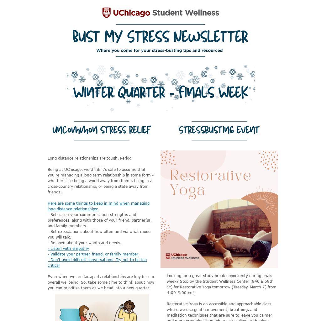 | Looking for a great study break opportunity during finals week? Stop by the Student Wellness Center (840 E 59th St) for Restorative Yoga tomorrow (Tuesday, March 7) from 4:00-5:00pm!