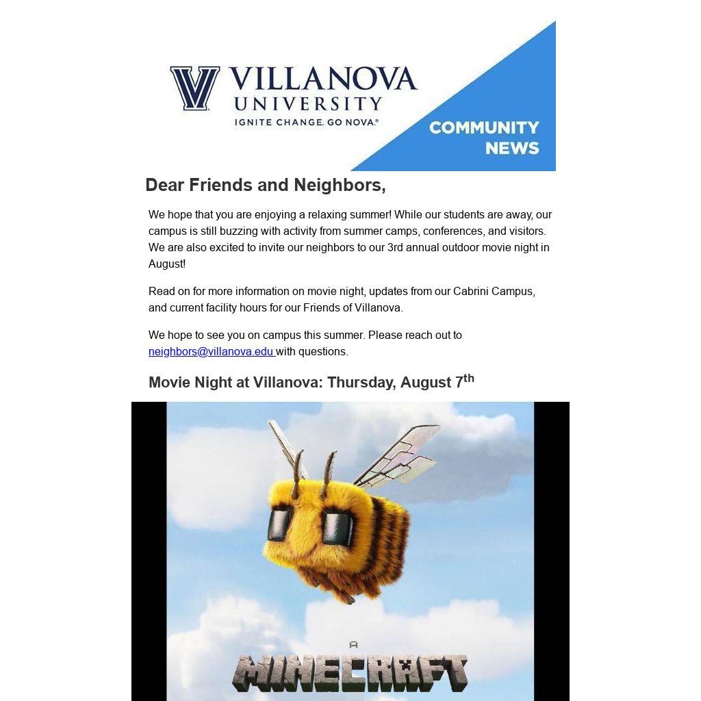 We hope to see you on campus this summer. Please reach out to neighbors@villanova.edu with questions.