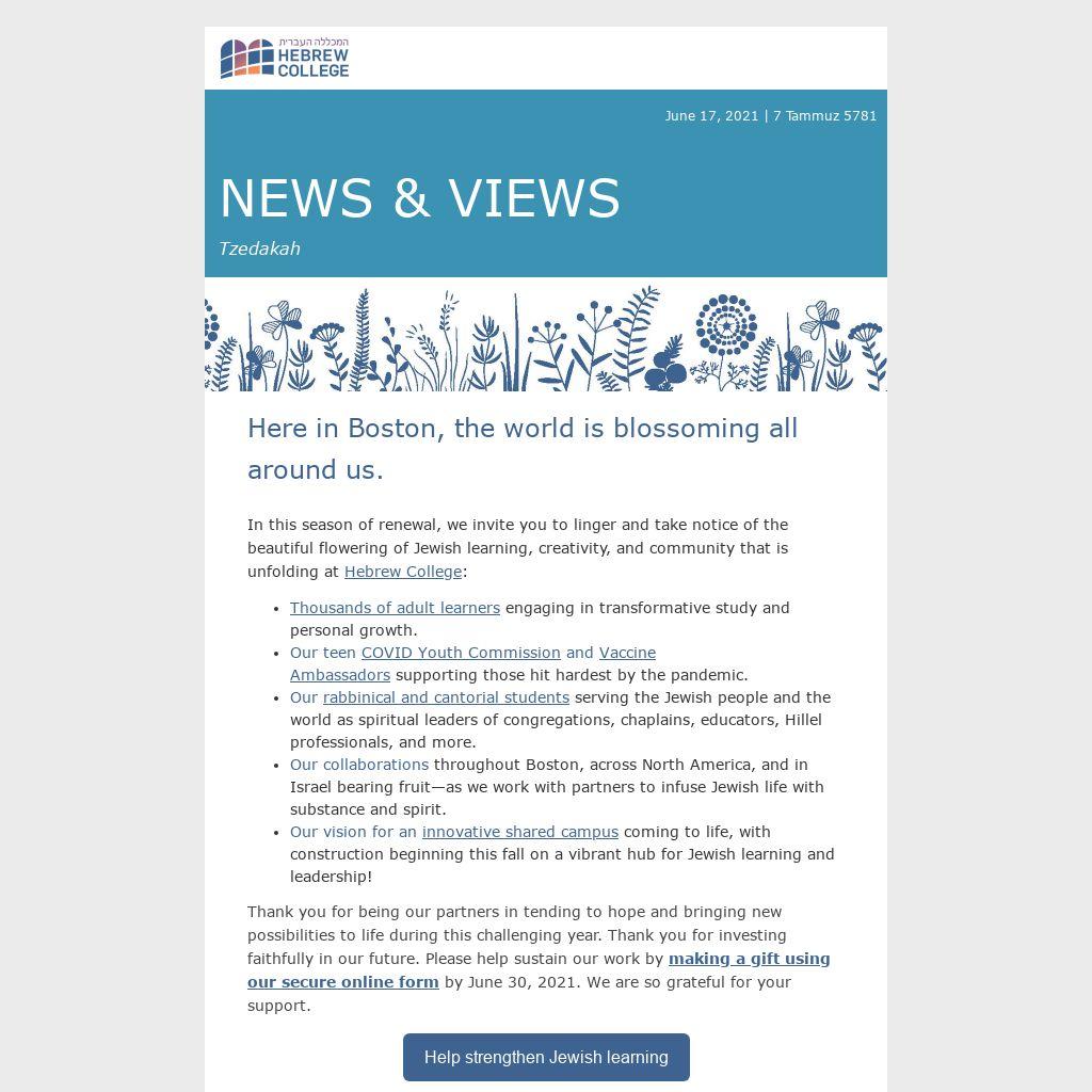 In this season of renewal, we invite you to linger and take notice of the beautiful flowering of Jewish learning, creativity, and community that is unfolding at Hebrew College:
