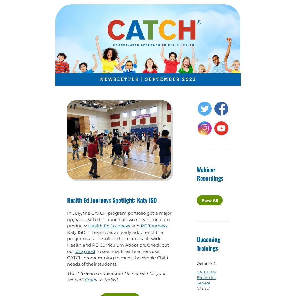 In July, the CATCH program portfolio got a major upgrade with the launch of two new curriculum products: Health Ed Journeys and PE Journeys. Katy ISD in Texas was an early adopter of the programs as a result of the recent statewide Health and PE Curriculum Adoption. Check out our blog post to see how their teachers use CATCH programming to meet the Whole Child needs of their students!