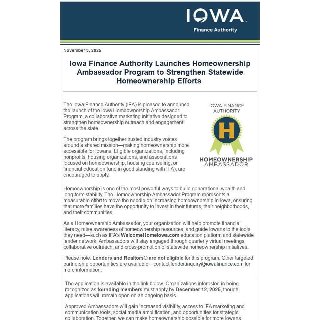 The Iowa Finance Authority (IFA) is pleased to announce the launch of the Iowa Homeownership Ambassador Program, a collaborative marketing initiative designed to strengthen homeownership outreach and engagement across the state.