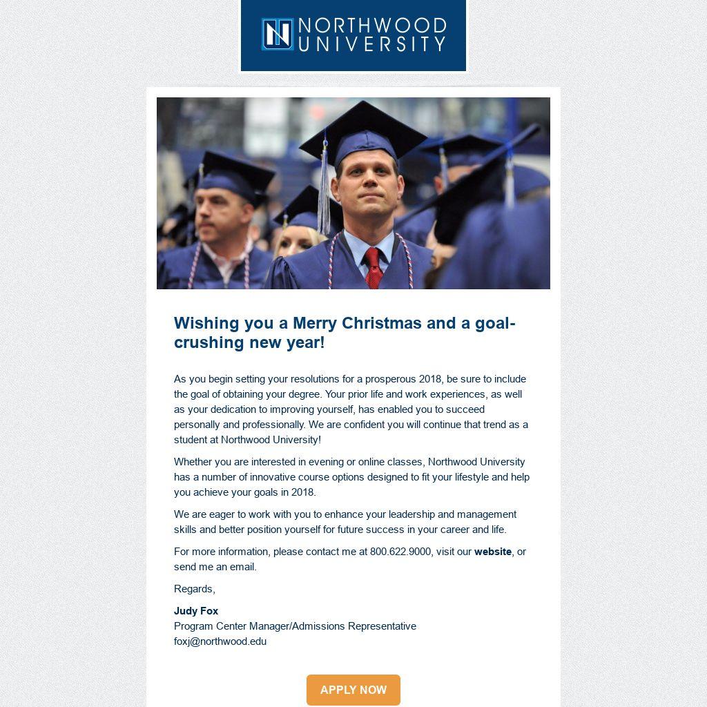As you begin setting your resolutions for a prosperous 2018, be sure to include the goal of obtaining your degree. Your prior life and work experiences, as well as your dedication to improving yourself, has enabled you to succeed personally and professionally. We are confident you will continue that trend as a student at Northwood University!