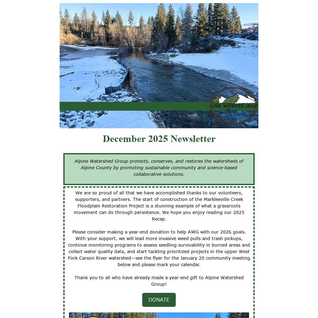Please consider making a year-end donation to help AWG with our 2026 goals. With your support, we will lead more invasive weed pulls and trash pickups, continue monitoring programs to assess seedling survivability in burned areas and collect water quality data, and start tackling prioritized projects in the upper West Fork Carson River watershed—see the flyer for the January 20 community meeting below and please mark your calendar.