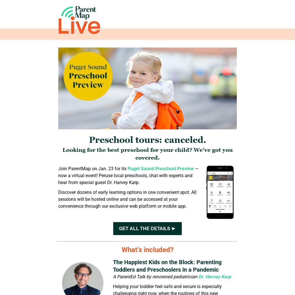 Puget Sound Preschool Preview — now a virtual event! Peruse local preschools, chat with experts and hear from special guest Dr. Harvey Karp.