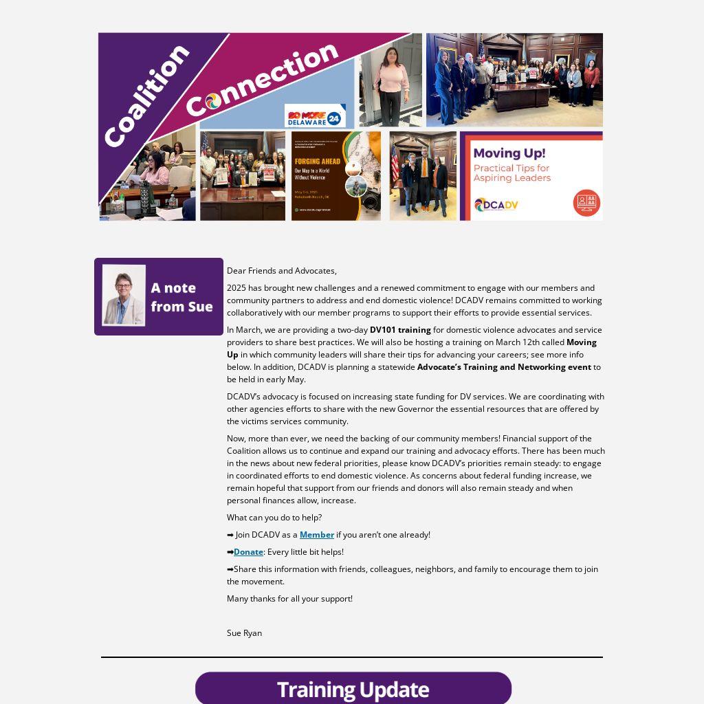 2025 has brought new challenges and a renewed commitment to engage with our members and community partners to address and end domestic violence! DCADV remains committed to working collaboratively with our member programs to support their efforts to provide essential services.