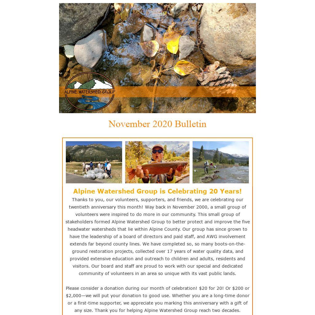 Thanks to you, our volunteers, supporters, and friends, we are celebrating our twentieth anniversary this month! Way back in November 2000, a small group of volunteers were inspired to do more in our community. This small group of stakeholders formed Alpine Watershed Group to better protect and improve the five headwater watersheds that lie within Alpine County. Our group has since grown to have the leadership of a board of directors and paid staff, and AWG involvement extends far beyond county lines. We have completed so, so many boots-on-the-ground restoration projects, collected over 17 years of water quality data, and provided extensive education and outreach to children and adults, residents and visitors. Our board and staff are proud to work with our special and dedicated community of volunteers in an area so unique with its vast public lands.