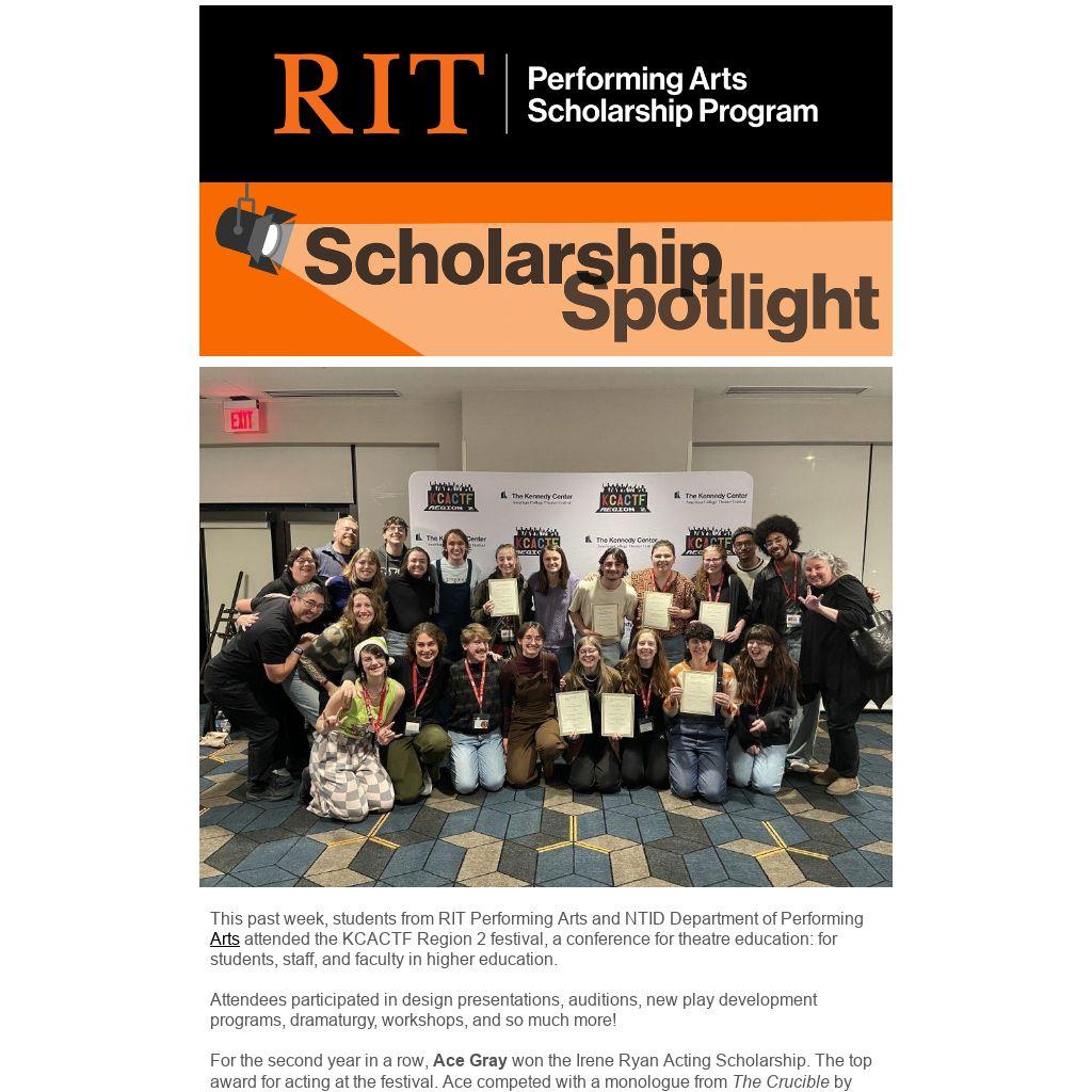 This past week, students from RIT Performing Arts and NTID Department of Performing Arts attended the KCACTF Region 2 festival, a conference for theatre education: for students, staff, and faculty in higher education.
