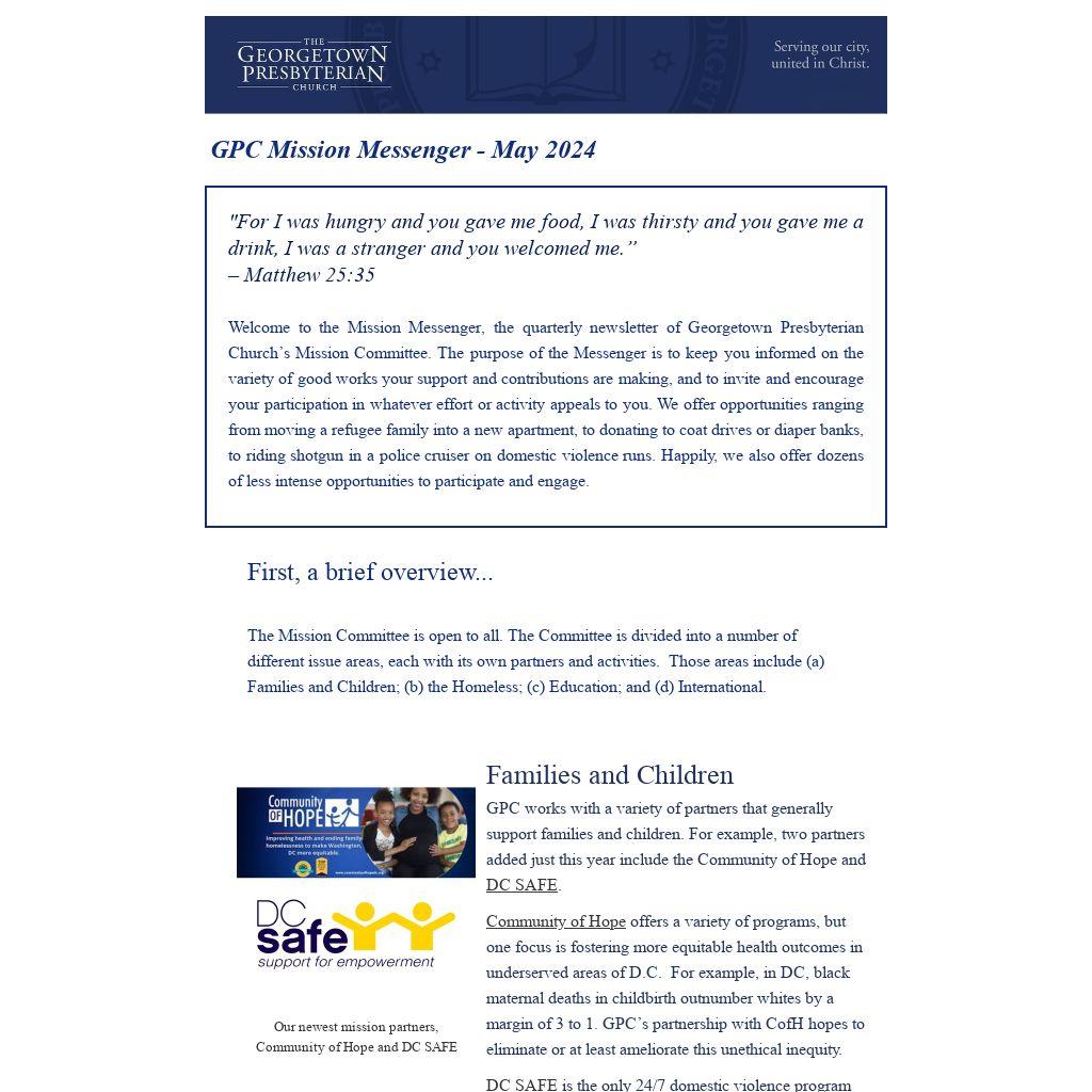 Welcome to the Mission Messenger, the quarterly newsletter of Georgetown Presbyterian Church’s Mission Committee. The purpose of the Messenger is to keep you informed on the variety of good works your support and contributions are making, and to invite and encourage your participation in whatever effort or activity appeals to you. We offer opportunities ranging from moving a refugee family into a new apartment, to donating to coat drives or diaper banks, to riding shotgun in a police cruiser on domestic violence runs. Happily, we also offer dozens of less intense opportunities to participate and engage.