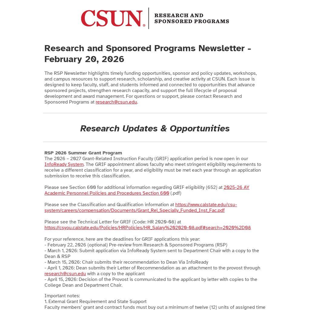 The RSP Newsletter highlights timely funding opportunities, sponsor and policy updates, workshops, and campus resources to support research, scholarship, and creative activity at CSUN. Each issue is designed to keep faculty, staff, and students informed and connected to opportunities that advance sponsored projects, strengthen research capacity, and support the full lifecycle of proposal development and award management. For questions or support, please contact Research and Sponsored Programs at research@csun.edu.