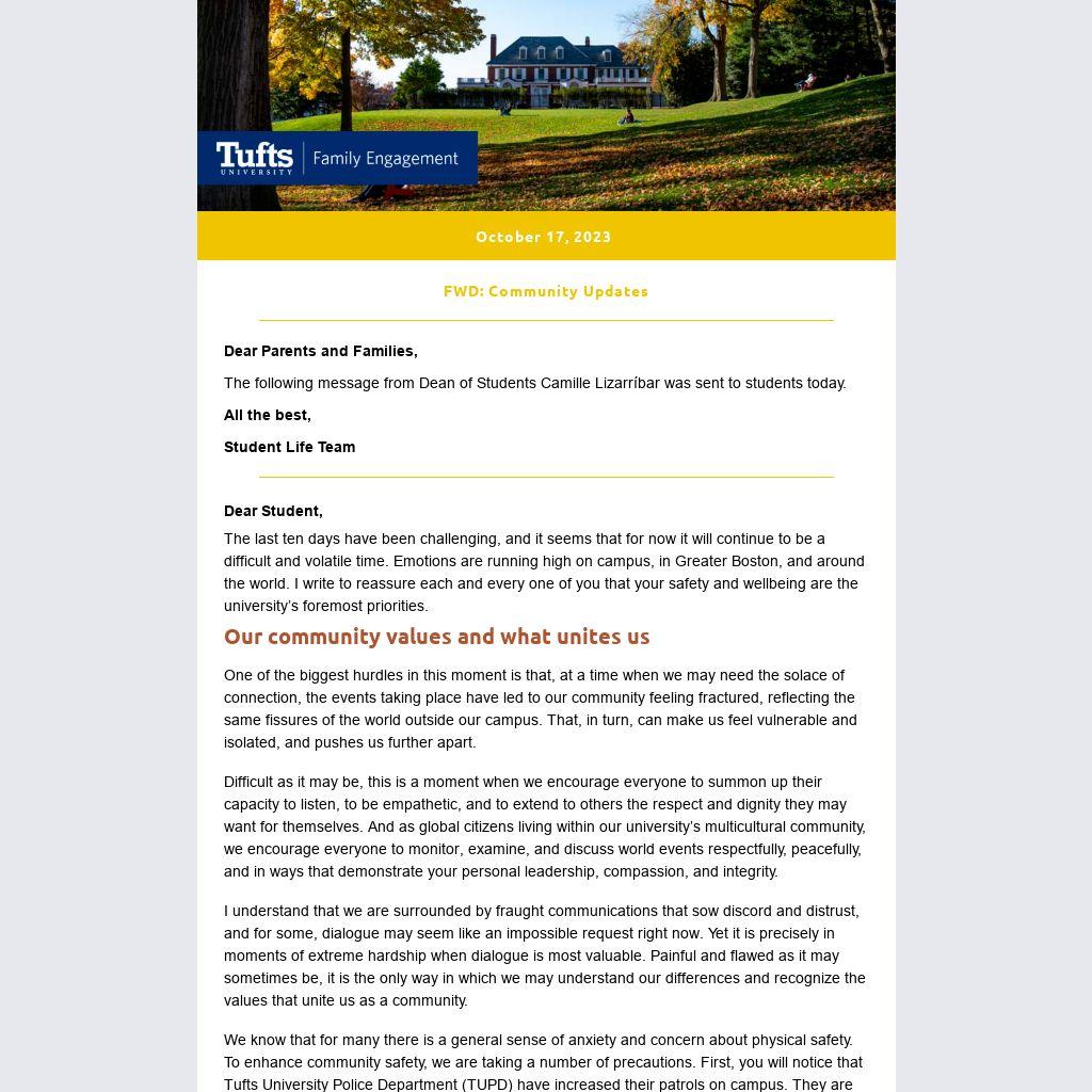 Active citizenship, including exercising free speech and engaging in protests, gatherings, and demonstrations, is a vital part of the Tufts community. We encourage you to read the Trustee Declaration on Freedom of Expression at Tufts University.