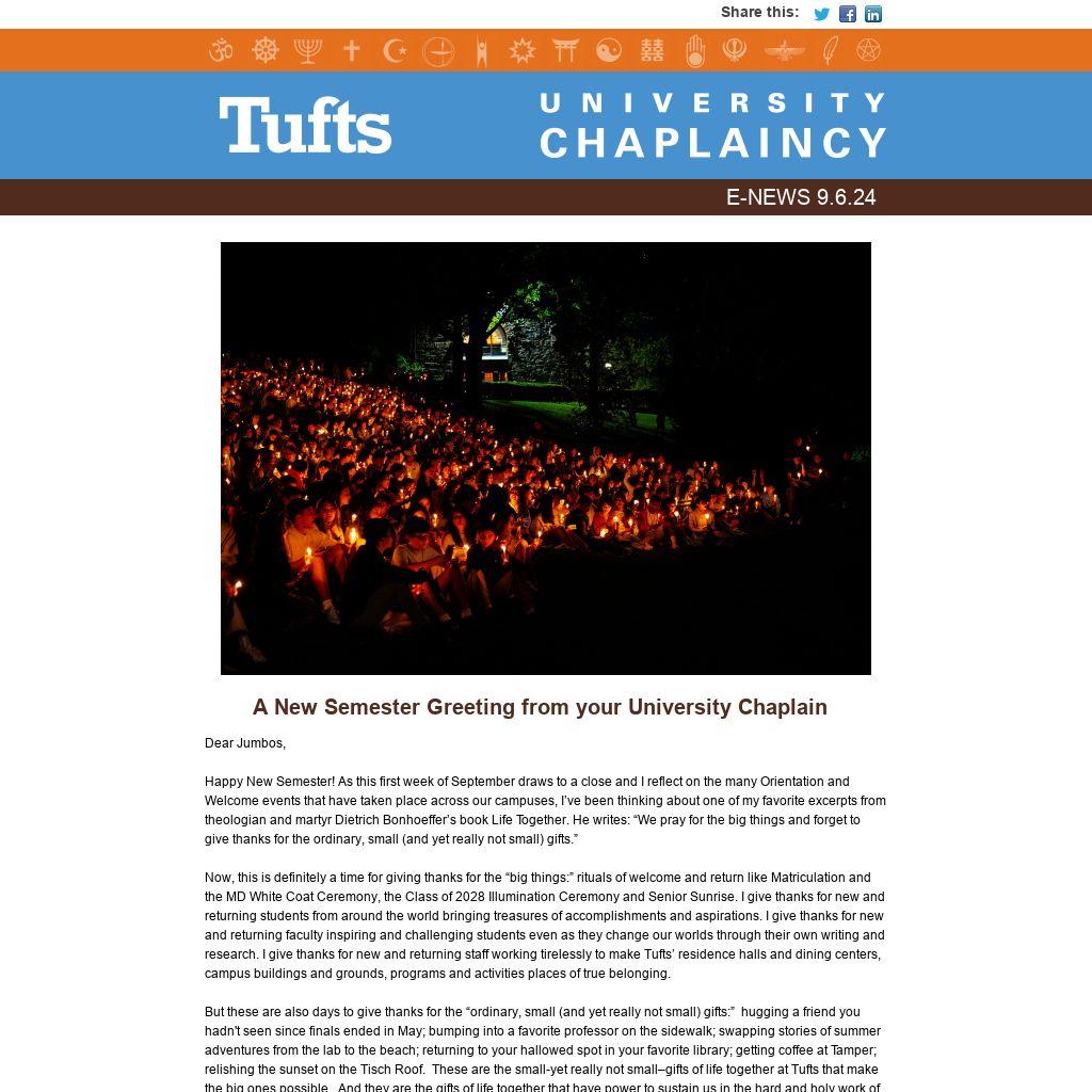 But these are also days to give thanks for the “ordinary, small (and yet really not small) gifts:” hugging a friend you hadn't seen since finals ended in May; bumping into a favorite professor on the sidewalk; swapping stories of summer adventures from the lab to the beach; returning to your hallowed spot in your favorite library; getting coffee at Tamper; relishing the sunset on the Tisch Roof. These are the small-yet really not small–gifts of life together at Tufts that make the big ones possible. And they are the gifts of life together that have power to sustain us in the hard and holy work of community building, reimagining and healing we are called to do together in this, and every, time. I am grateful to begin this year at Tufts with all of you.