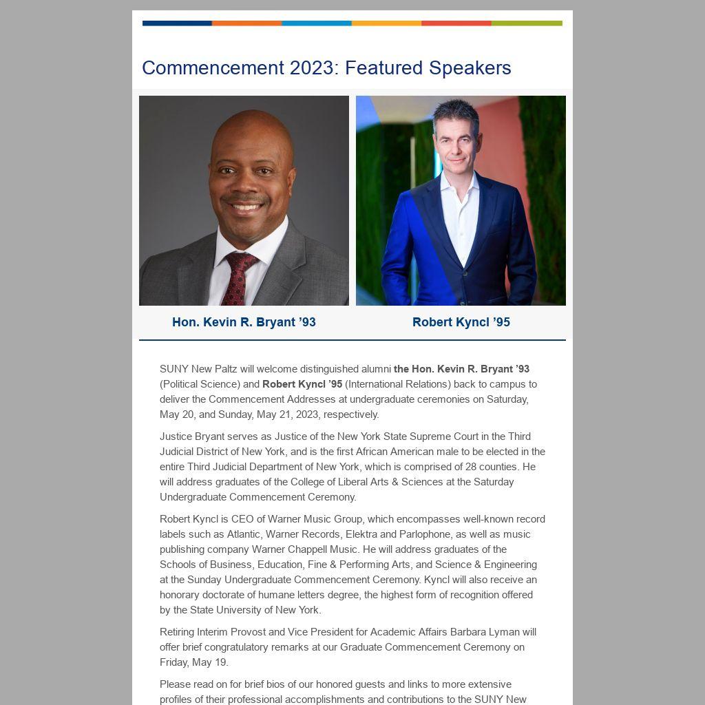SUNY New Paltz will welcome distinguished alumni the Hon. Kevin R. Bryant ’93 (Political Science) and Robert Kyncl ’95 (International Relations) back to campus to deliver the Commencement Addresses at undergraduate ceremonies on Saturday, May 20, and Sunday, May 21, 2023, respectively.