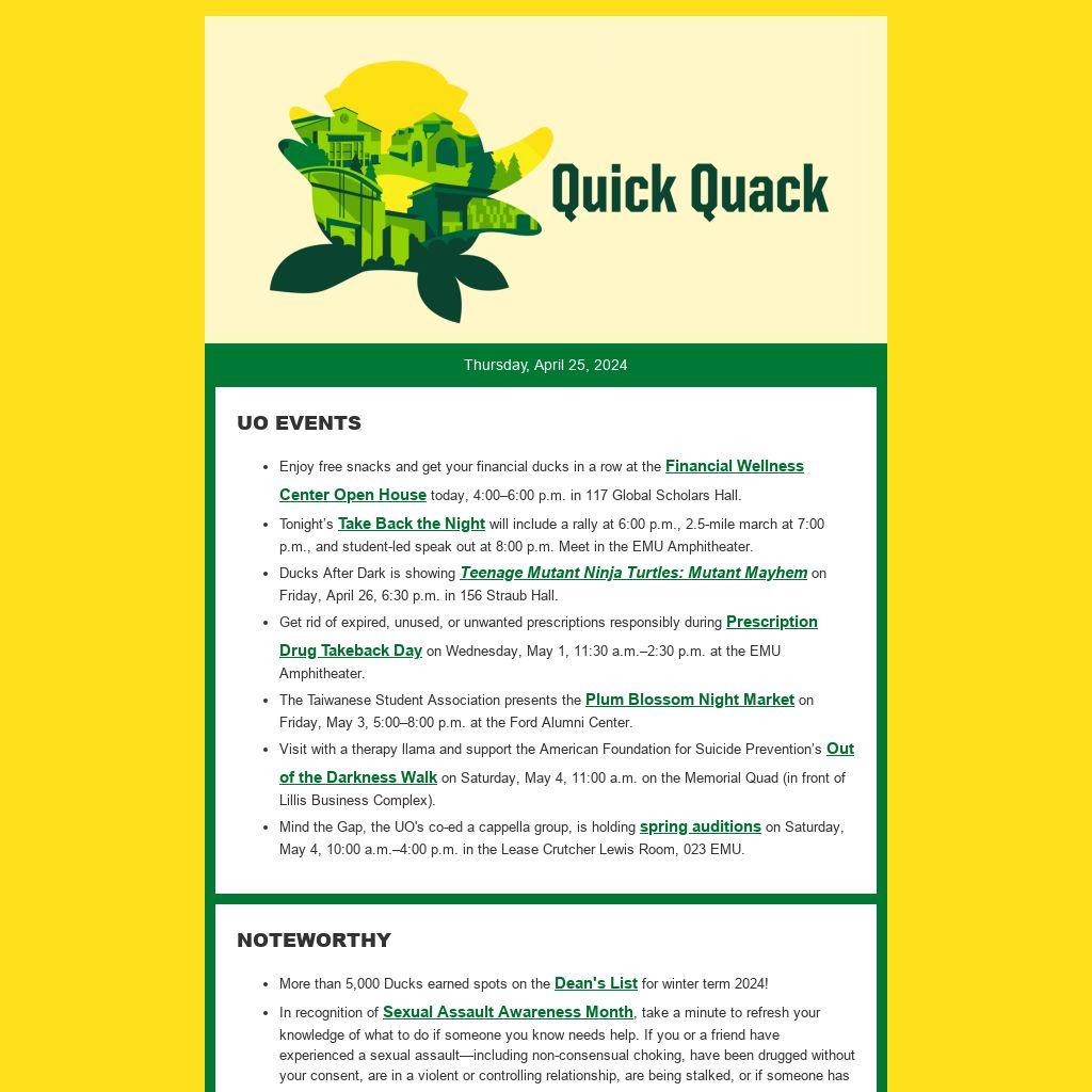 - Ducks After Dark is showing Teenage Mutant Ninja Turtles: Mutant Mayhem on Friday, April 26, 6:30 p.m. in 156 Straub Hall.
