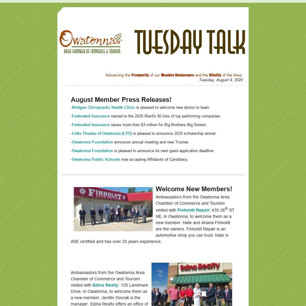 The governor’s mask order went into effect on July 25th for indoor spaces. The State of MN has sent the Owatonna Chamber disposable masks to distribute to businesses in the county.