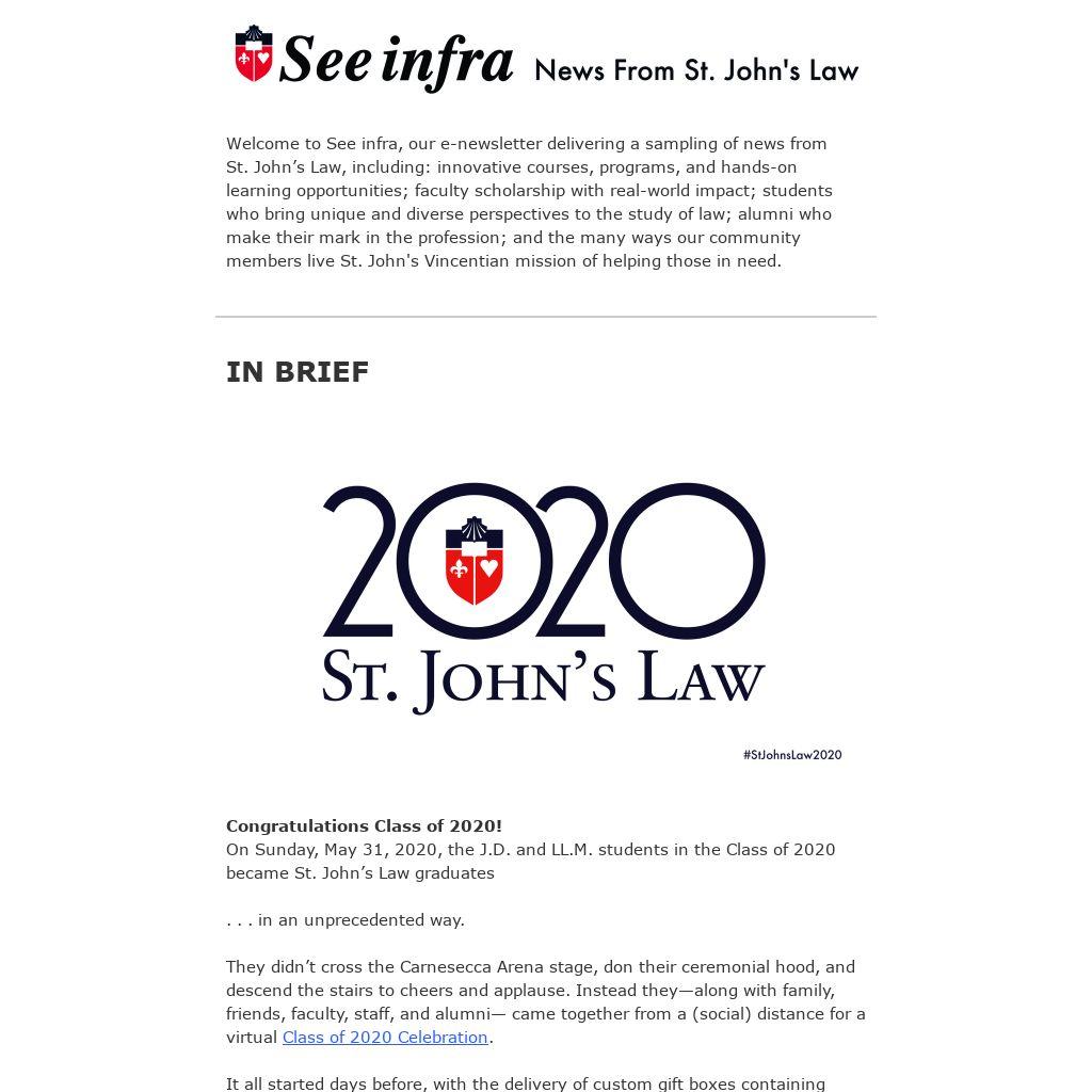 | Welcome to See infra, our e-newsletter delivering a sampling of news from St. John’s Law, including: innovative courses, programs, and hands-on learning opportunities; faculty scholarship with real-world impact; students who bring unique and diverse perspectives to the study of law; alumni who make their mark in the profession; and the many ways our community members live St. John's Vincentian mission of helping those in need.