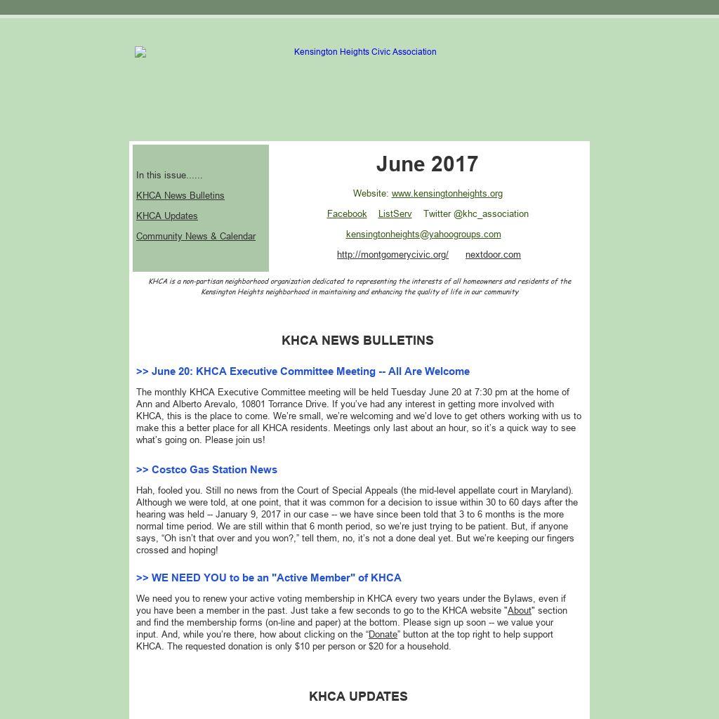 Representatives from KHCA (Karen Cordry, President & Chris Peoples, Public Safety Chair) attended the second meeting of the Wheaton Safety Task Force on May 22. Items discussed by the group included safety issues in the Wheaton Metro parking garage, crime at the Wheaton Metro station, installation of new CCTV equipment at Westfield Wheaton, the Citizen Police Academy, as well as general crime information from the Montgomery County Police Department.