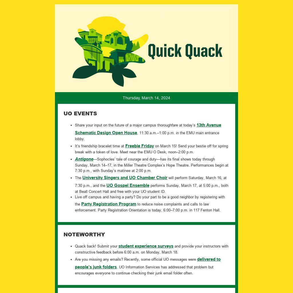- Quack back! Submit your student experience surveys and provide your instructors with constructive feedback before 6:00 a.m. on Monday, March 18.