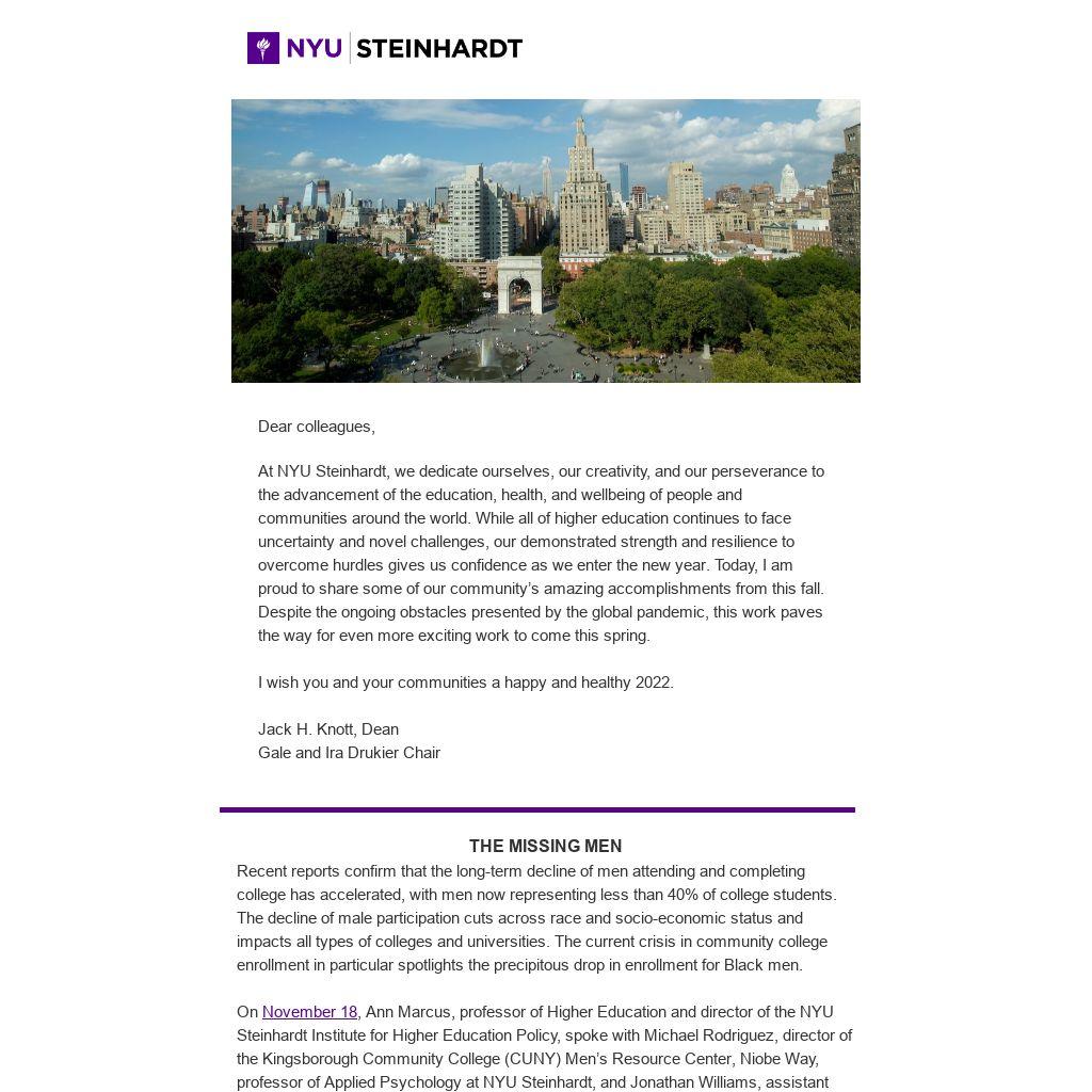 At NYU Steinhardt, we dedicate ourselves, our creativity, and our perseverance to the advancement of the education, health, and wellbeing of people and communities around the world. While all of higher education continues to face uncertainty and novel challenges, our demonstrated strength and resilience to overcome hurdles gives us confidence as we enter the new year. Today, I am proud to share some of our community’s amazing accomplishments from this fall. Despite the ongoing obstacles presented by the global pandemic, this work paves the way for even more exciting work to come this spring.