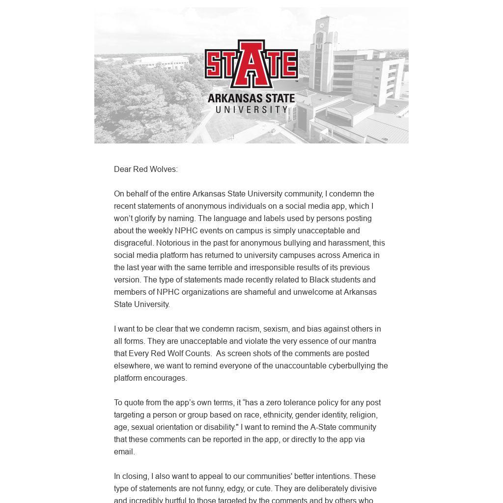 On behalf of the entire Arkansas State University community, I condemn the recent statements of anonymous individuals on a social media app, which I won’t glorify by naming. The language and labels used by persons posting about the weekly NPHC events on campus is simply unacceptable and disgraceful. Notorious in the past for anonymous bullying and harassment, this social media platform has returned to university campuses across America in the last year with the same terrible and irresponsible results of its previous version. The type of statements made recently related to Black students and members of NPHC organizations are shameful and unwelcome at Arkansas State University.