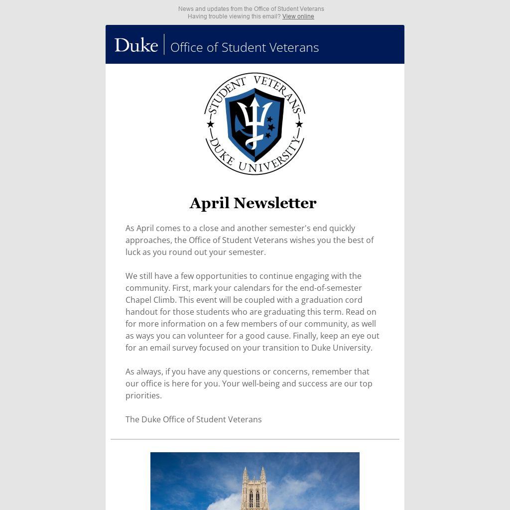 The Office of Student Veterans is surveying Duke's military-affiliated community to better understand how our community transitions to, and is a part of, the broader Duke community. This survey will allow us to understand current student perspectives and make Duke a more welcoming and inclusive community in the future.