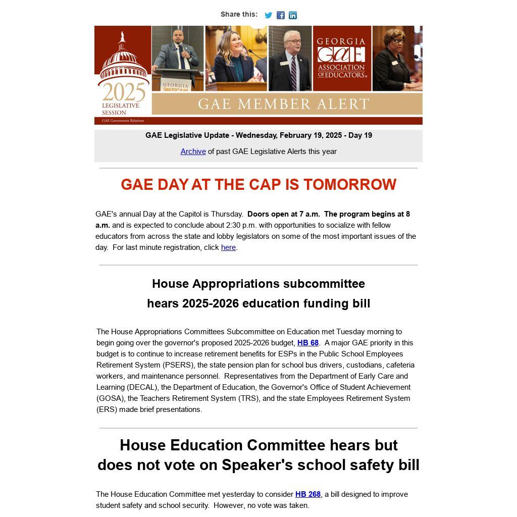 GAE Legislative Update - Wednesday, February 19, 2025 - Day 19