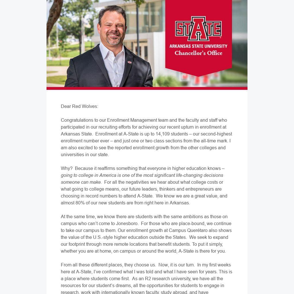 Congratulations to our Enrollment Management team and the faculty and staff who participated in our recruiting efforts for achieving our recent upturn in enrollment at Arkansas State. Enrollment at A-State is up to 14,109 students – our second-highest enrollment number ever – and just one or two class sections from the all-time mark. I am also excited to see the reported enrollment growth from the other colleges and universities in our state.