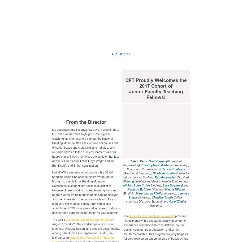 Over the coming months, the CFT newsletter will highlight the work of this year's Junior Faculty Teaching Fellows. Each month two fellows will be featured discussing their teaching philosophies and interests.