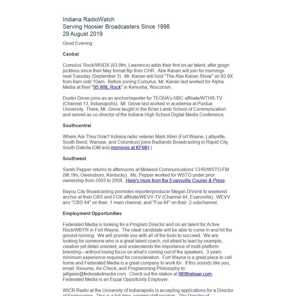 Indiana RadioWatch subscriptions are free. To subscribe, send an e-mail to irw@well.com and we'll add you. After publication, we archive Indiana RadioWatch on the Indiana Radio Archive at http://www.indianaradio.net. Please e-mail us your news stories and employment opportunities.