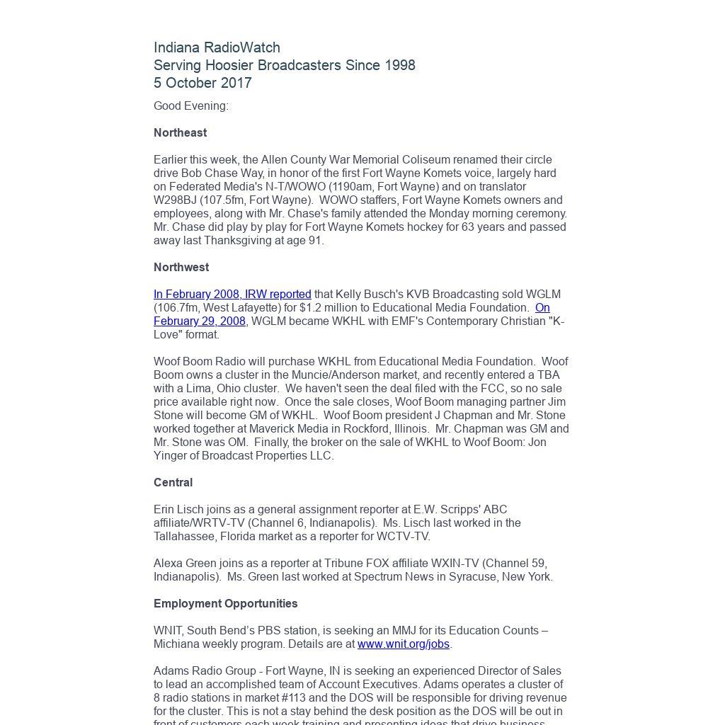 Indiana RadioWatch subscriptions are free. To subscribe, send an e-mail to irw@well.com and we'll add you. After publication, we archive Indiana RadioWatch on the Indiana Radio Archive at http://www.indianaradio.net. Please e-mail us your news stories and employment opportunities.