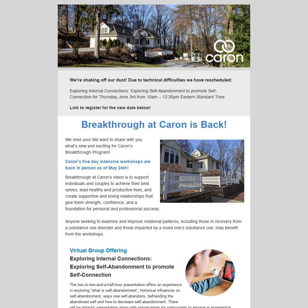 Breakthrough at Caron’s vision is to support individuals and couples to achieve their best selves, lead healthy and productive lives, and create supportive and loving relationships that give them strength, confidence, and a foundation for personal and professional success.