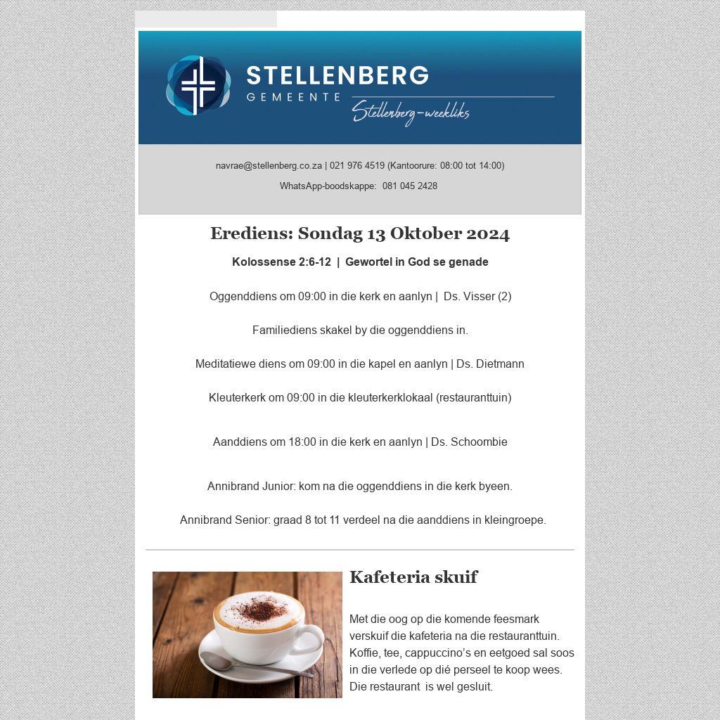 Jy kan gemeentenuus weekliks deur middel van die Stellenberg-weekliks per e-pos ontvang. Stuur jou e-posadres aan sanel@stellenberg.co.za. - Op jou selfoon: