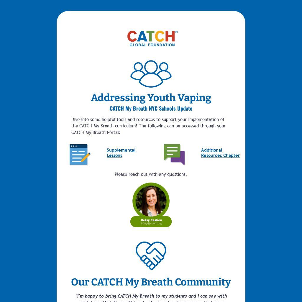 Dive into some helpful tools and resources to support your implementation of the CATCH My Breath curriculum! The following can be accessed through your CATCH My Breath Portal: